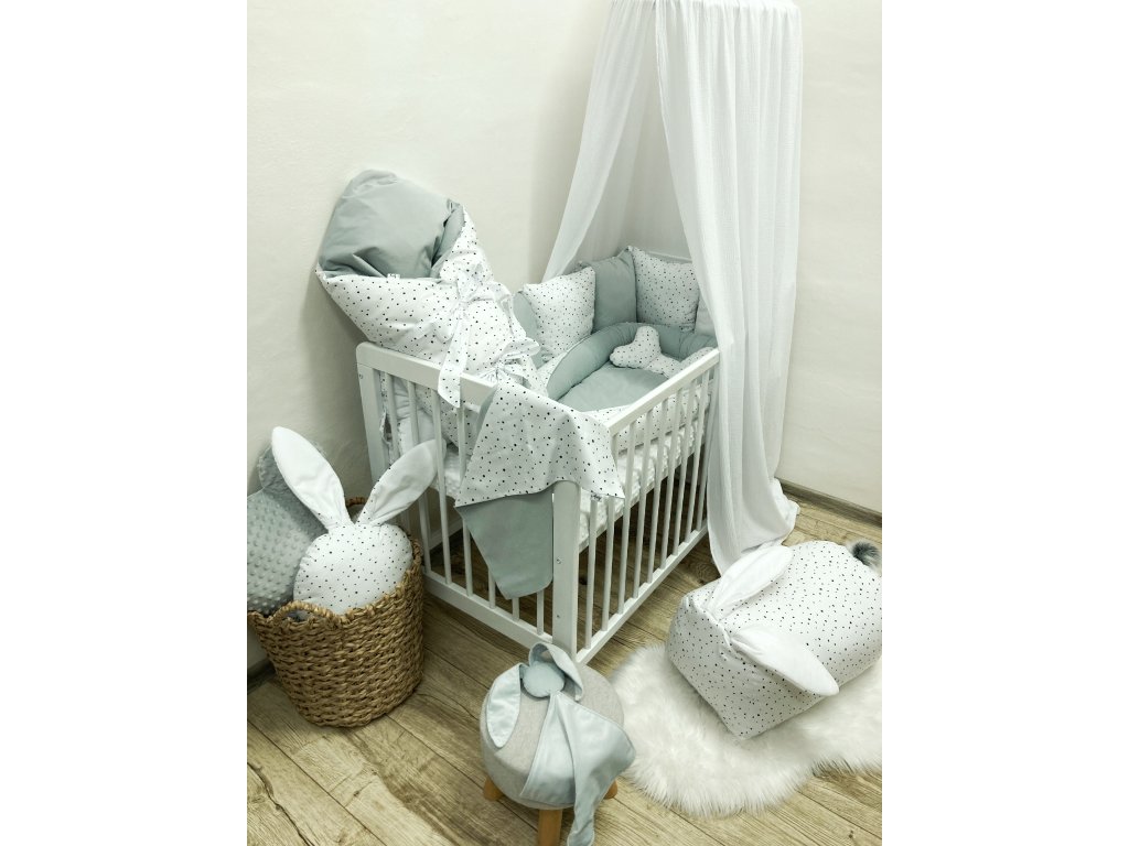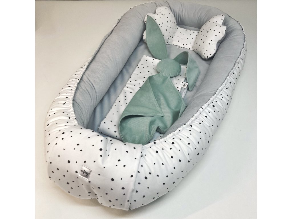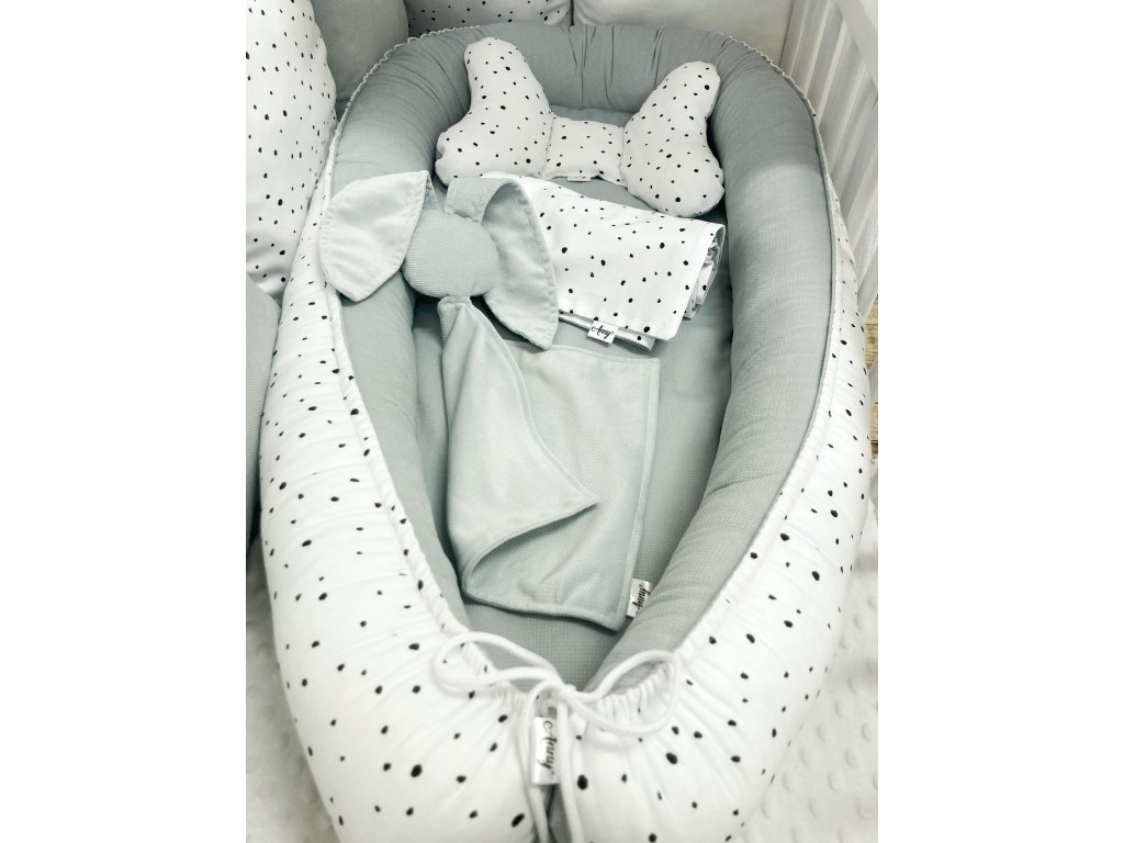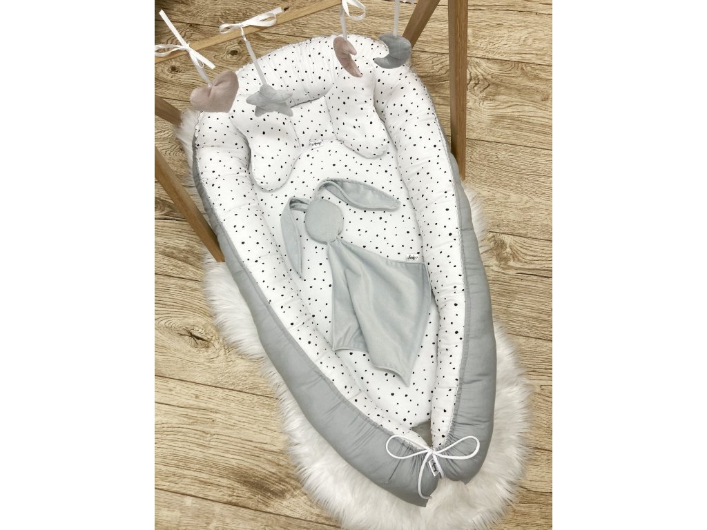 Oboustranné hnízdečko pro miminko s jemnými černými puntíky na bíle v kombinaci s šedým velvetem.