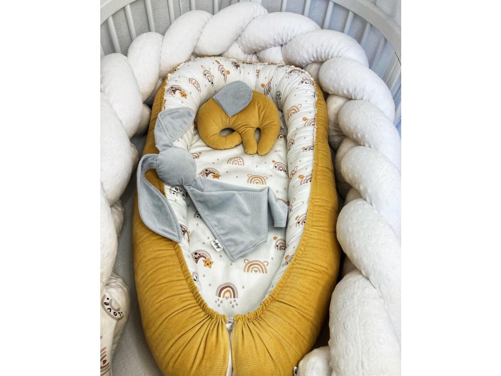 Oboustranné hnízdečko pro miminko v roztomilém vzoru duhy v kombinaci s hořčicovým sametovým velvetem.