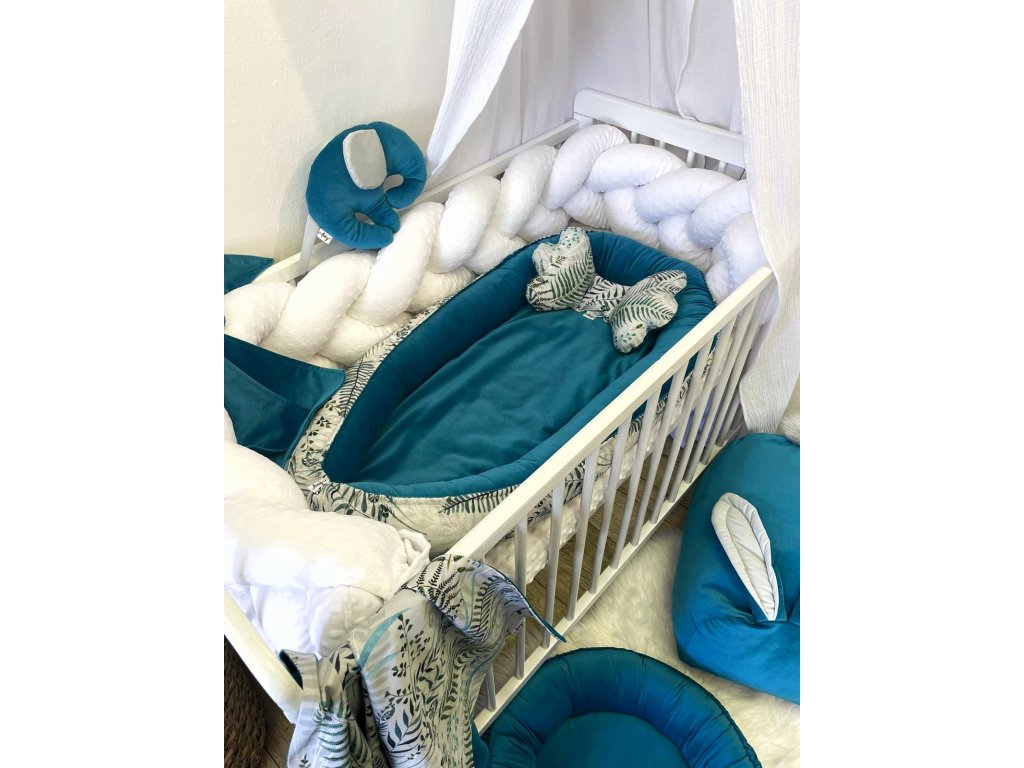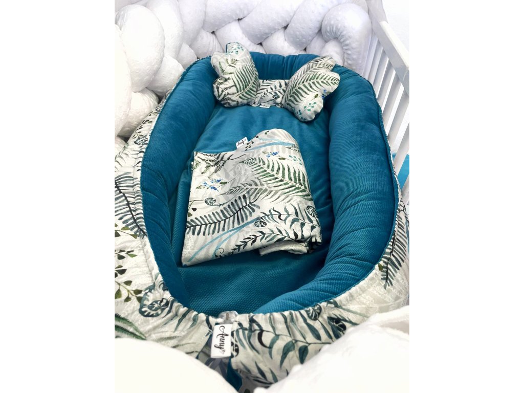Oboustranné hnízdečko pro miminko v nádherném vzoru lesního kapradí v kombinaci s petrolejovým sametovým velvetem.