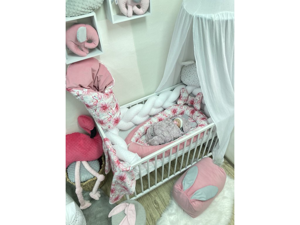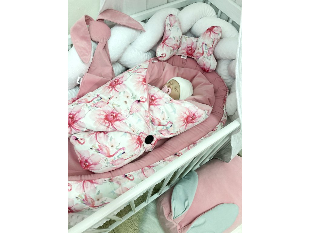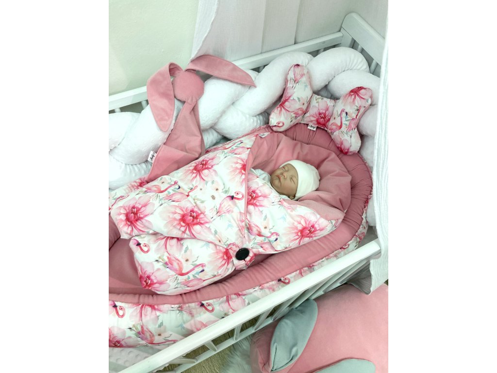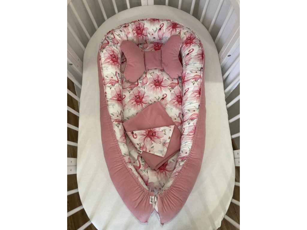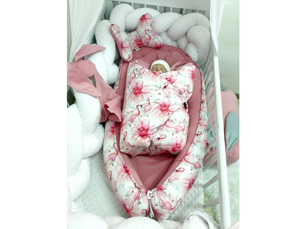 Oboustranné hnízdečko pro miminko s rozkošnými růžovými plameňáky v kombinaci s růžovým velvetem.