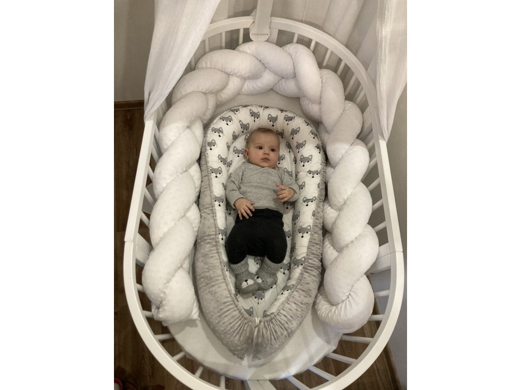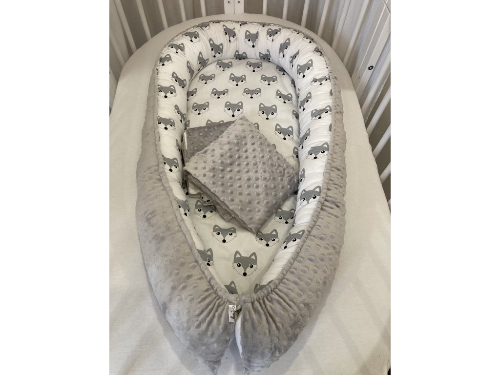 Oboustranné hnízdečko pro miminko v roztomilém vzoru šedých lišek v kombinaci s šedou sametovou minky látkou.