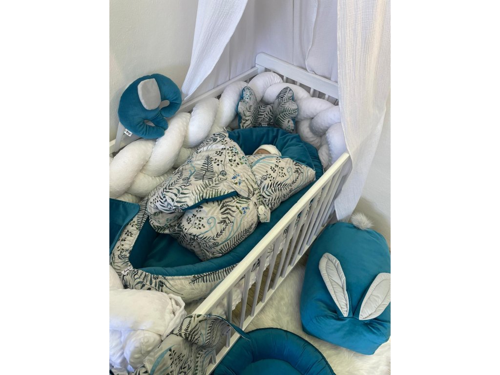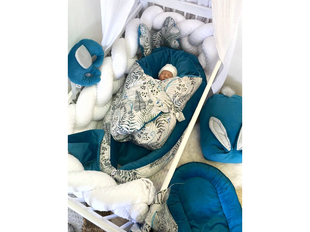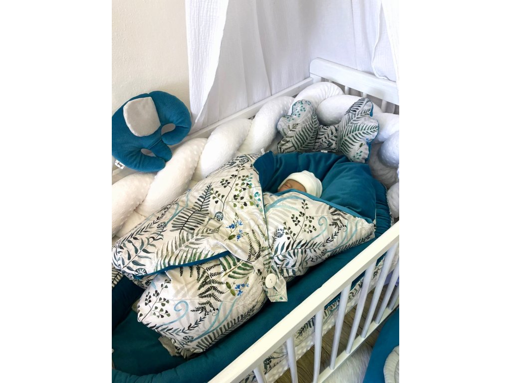 Nadýchaná oboustranná péřová zavinovačka pro kluky, z nádherné prémiové bavlny s kapradím, v kombinaci se sametovým velvetem petrolejové barvy.